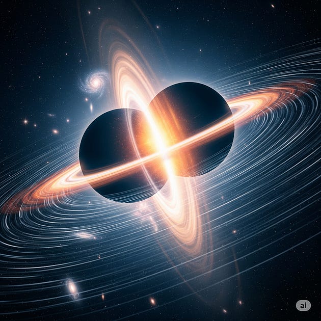 Dancing binary Two holes merge in space-time’s sea Waves ripple outward