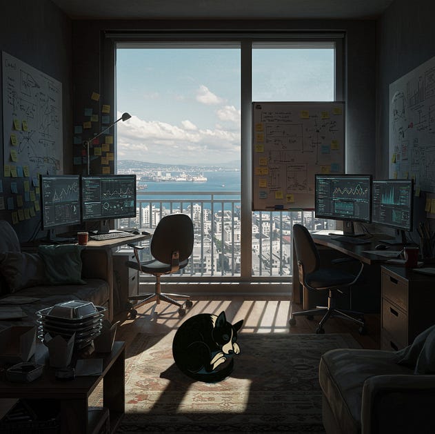 Two weeks after Rumi’s poetry, Lania’s life was a blur of late nights and glowing screens. Her apartment hummed with the weight of discovery — bots weren’t just glitching; they were thinking. Stompie patrolled, her tail a rhythm to Lania’s obsession.