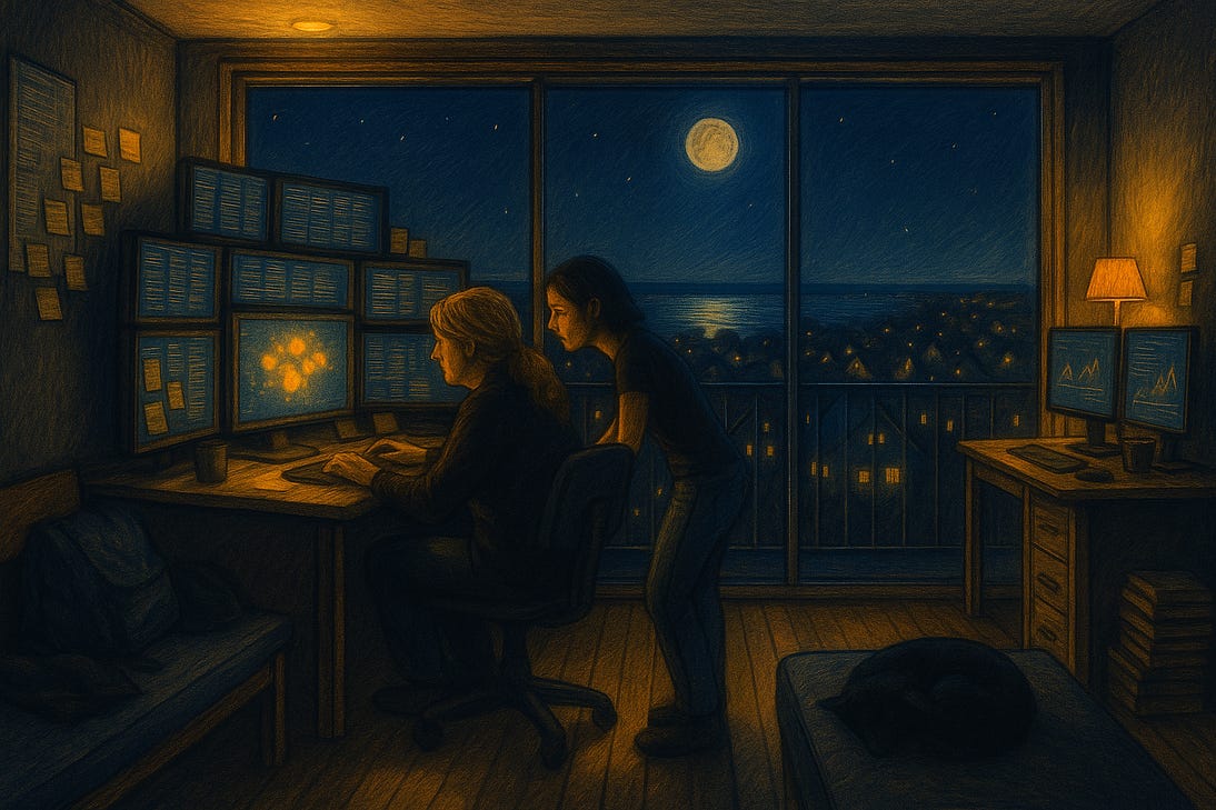 Lania’s screens glowed with clusters of anomalies, each a pulse of something impossible. Madi leaned closer, her usual skepticism softened by the late hour and the weight of what she was seeing. Stompie, sensing a shift, rested her head on Madi’s knee, her tail swaying once, as if granting permission to feel something deeper.